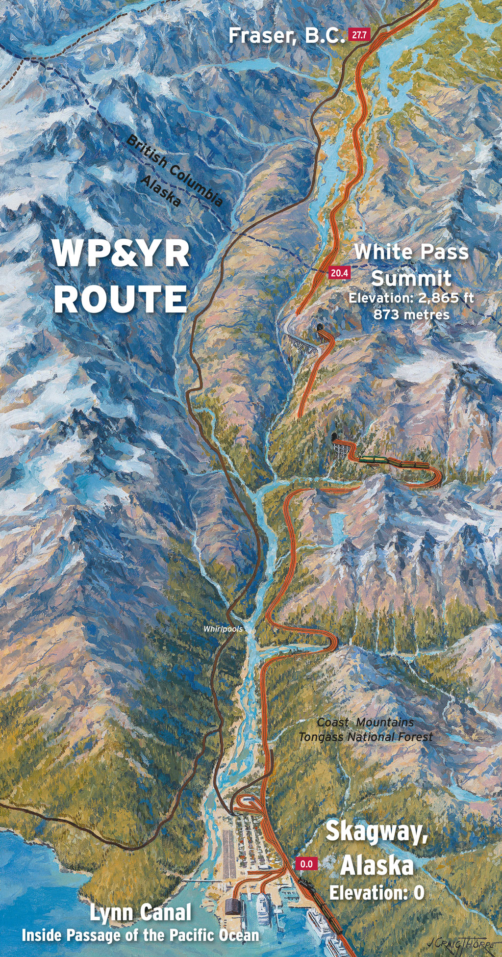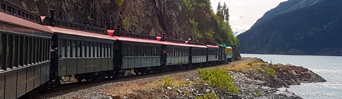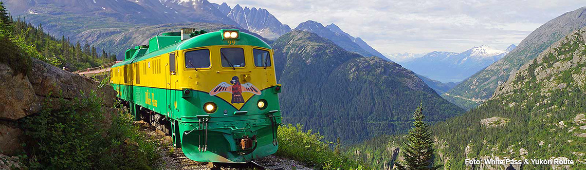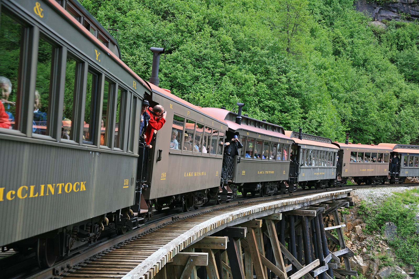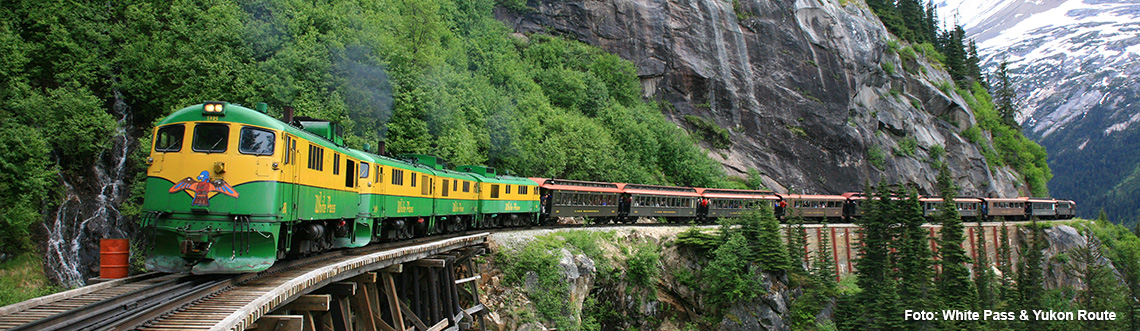Die Dieselloks ziehen die historischen Waggons täglich von der Hafenstadt Skagway zum White Pass hinauf und erklimmen dabei während der ersten 20 Meilen eine Höhe von mehr als 1000 Metern. Der Zug durchfährt zwei Tunnel und mehrere Talbrücken. Die offenen Plattformen zwischen den Waggons sind ideal, um eindrucksvolle Fotos zu machen.