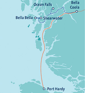Darüber hinaus wird das Schiff die Häfen in Bella Bella, Ocean Falls und Sherwater anfahren sowohl im Sommer als auch im Winter.